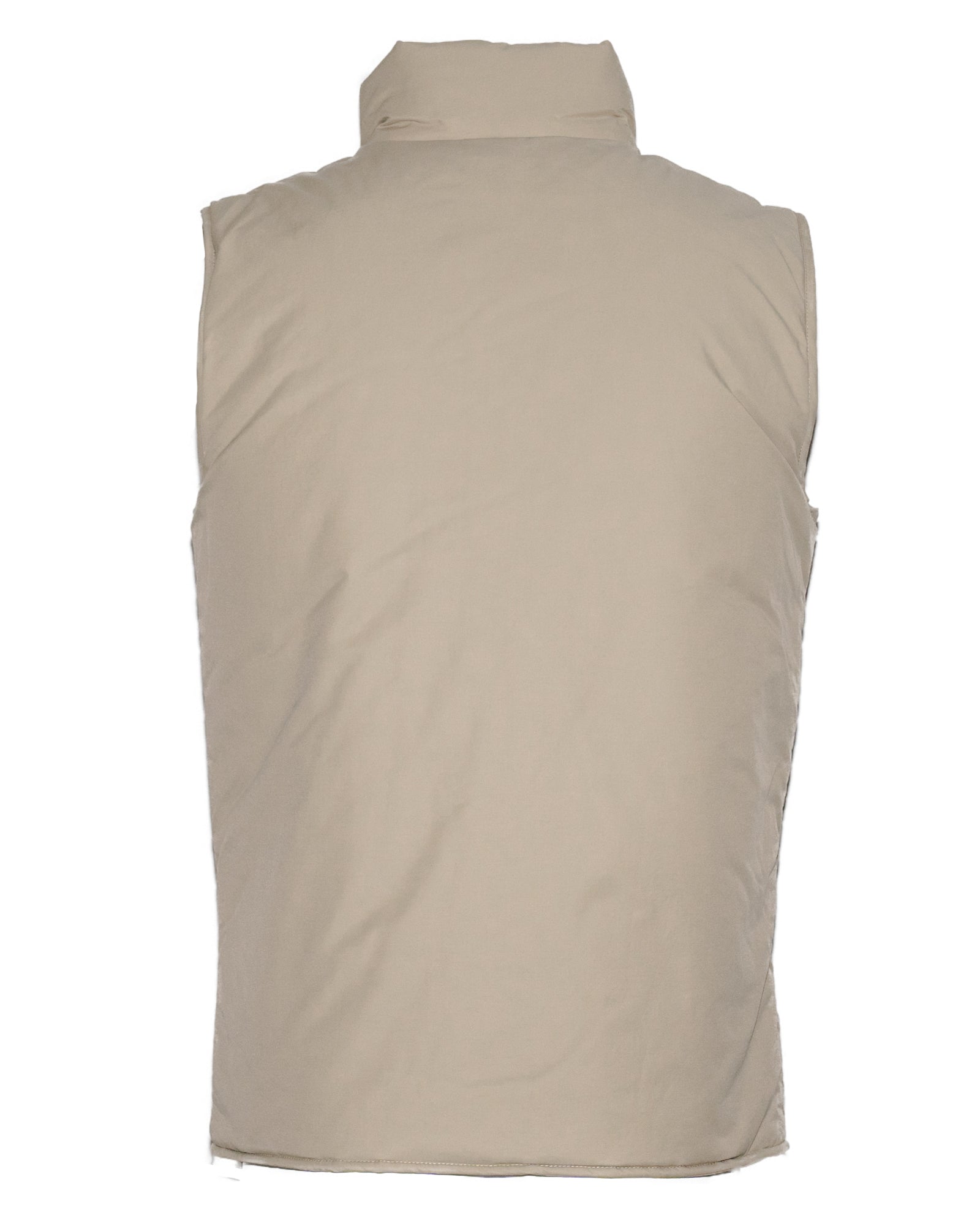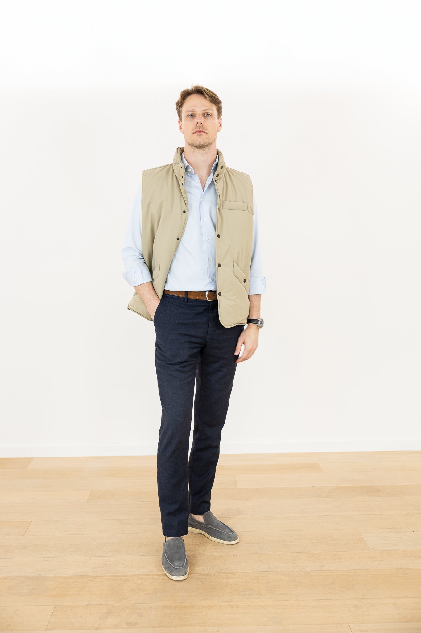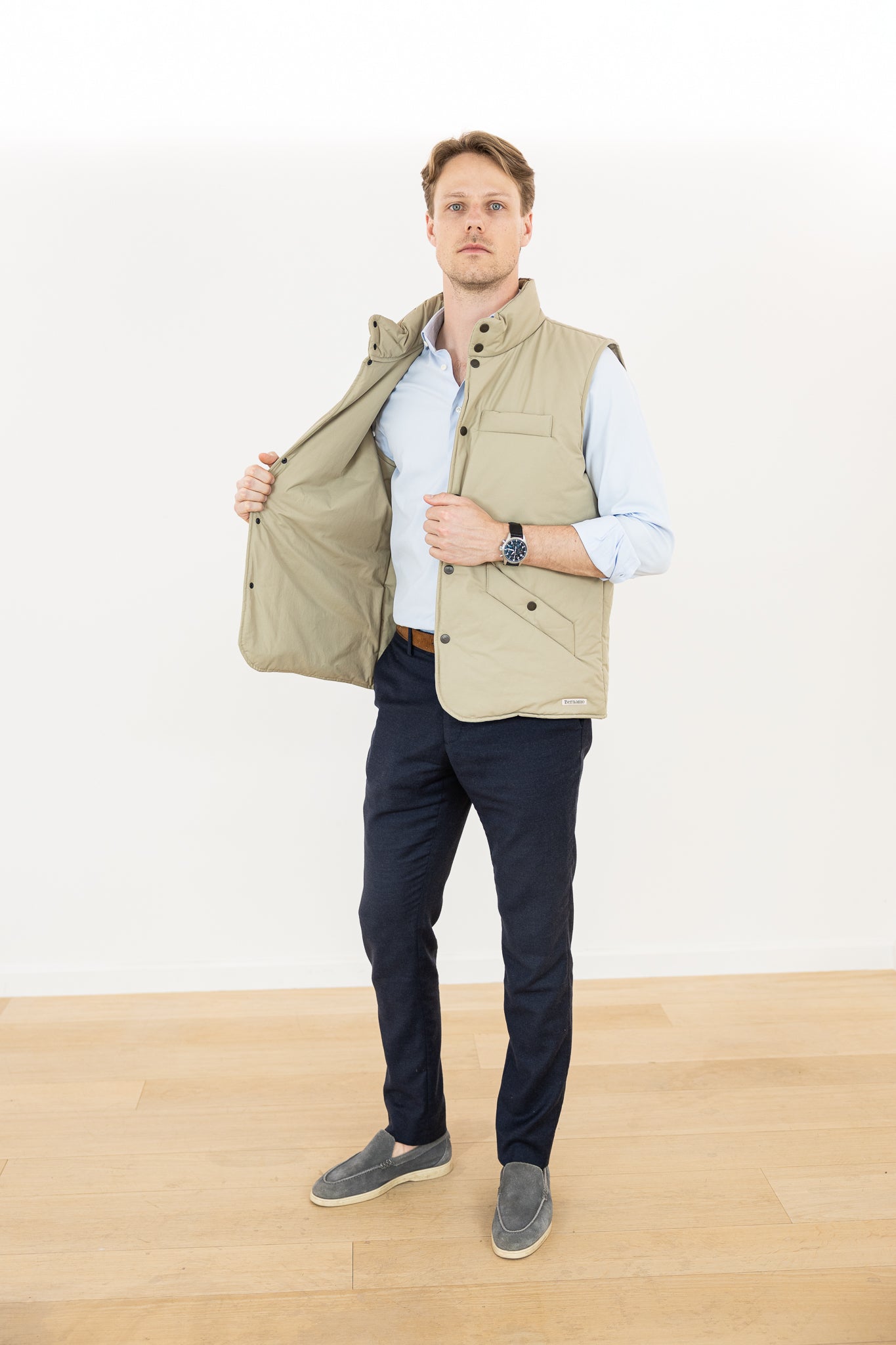 This vest is the ideal option for midseason days. Made from a sustainable blend of cotton and recycled polyamide, it offers a comfortable and breathable fit. The insulating fill, composed of recycled down and feather fibres, provides excellent warmth and comfort. The Italian water-repellent fabric, woven by Olmetex, offers protection against light rain, while the practical pockets—both inside and out—provide ample space for your essentials. Handmade in the EU, this vest strikes the perfect balance between style, functionality, and sustainability.