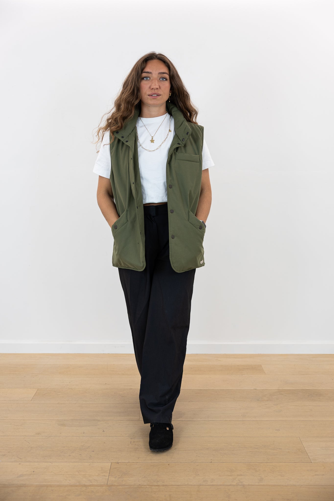 This vest is the ideal option for midseason days. Made from a sustainable blend of organic cotton and recycled polyamide, it offers a comfortable and breathable fit. The insulating fill, composed of recycled down and feather fibres, provides excellent warmth and comfort. The Italian water-repellent fabric, woven by Olmetex, offers protection against light rain, while the practical pockets—both inside and out—provide ample space for your essentials. Handmade in the EU, this vest strikes the perfect balance between style, functionality, and sustainability.