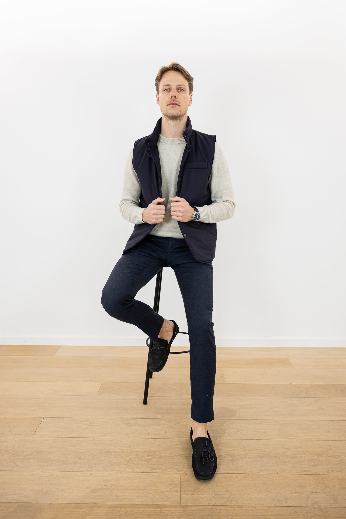 This vest is the ideal option for midseason days. Made from a sustainable blend of organic cotton and recycled polyamide, it offers a comfortable and breathable fit. The insulating fill, composed of recycled down and feather fibres, provides excellent warmth and comfort. The Italian water-repellent fabric, woven by Olmetex, offers protection against light rain, while the practical pockets—both inside and out—provide ample space for your essentials. Handmade in the EU, this vest strikes the perfect balance between style, functionality, and sustainability.