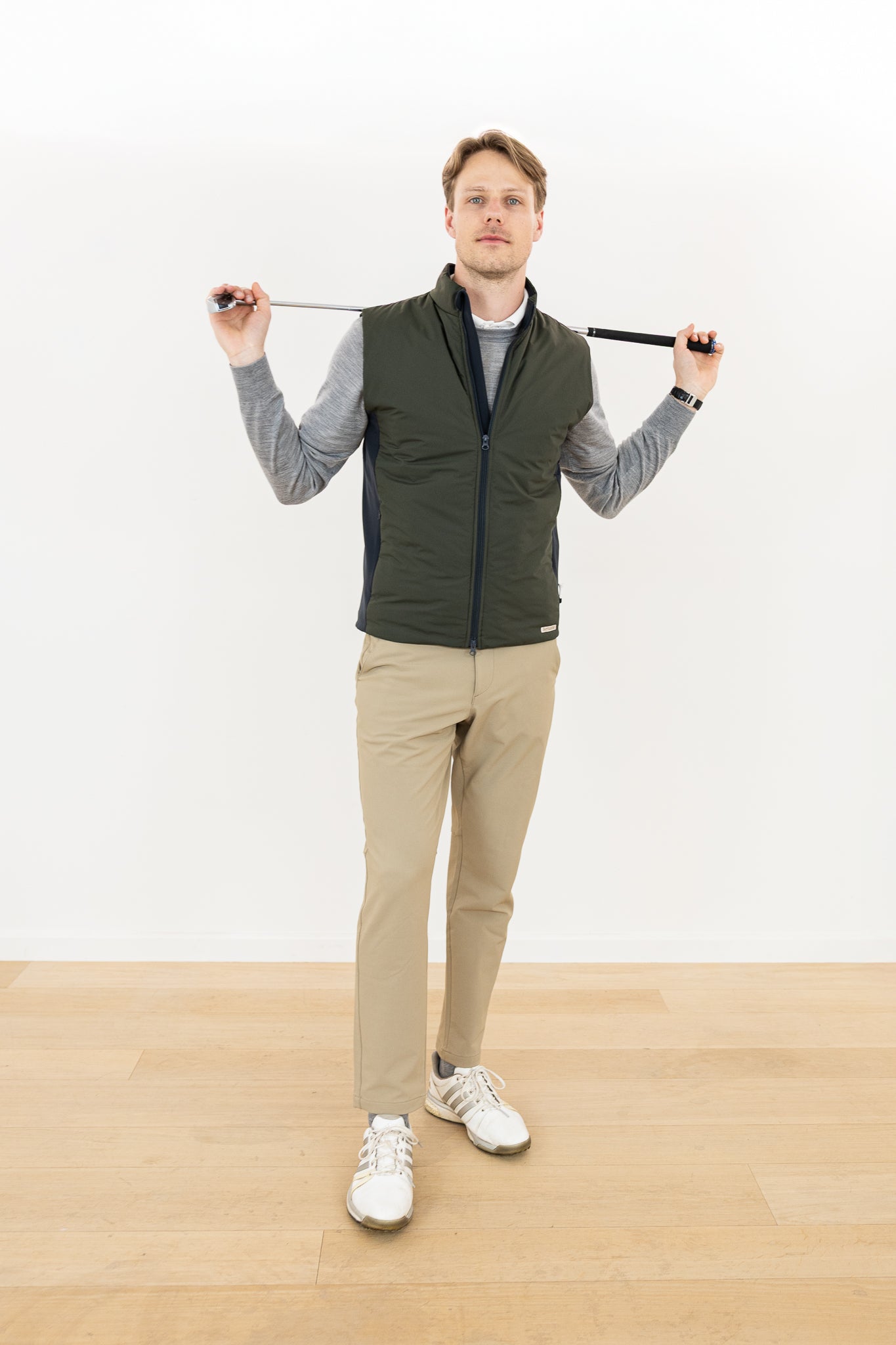 This all-season golf bodywarmer is the perfect blend of style, innovation, and practicality, designed to elevate your performance on and off the course. Crafted from advanced technical fabrics with a stretchable design, it offers exceptional comfort and a tailored fit that moves seamlessly with your body. The breathable, lightweight insulation ensures warmth without bulk, making it ideal for all weather conditions.
