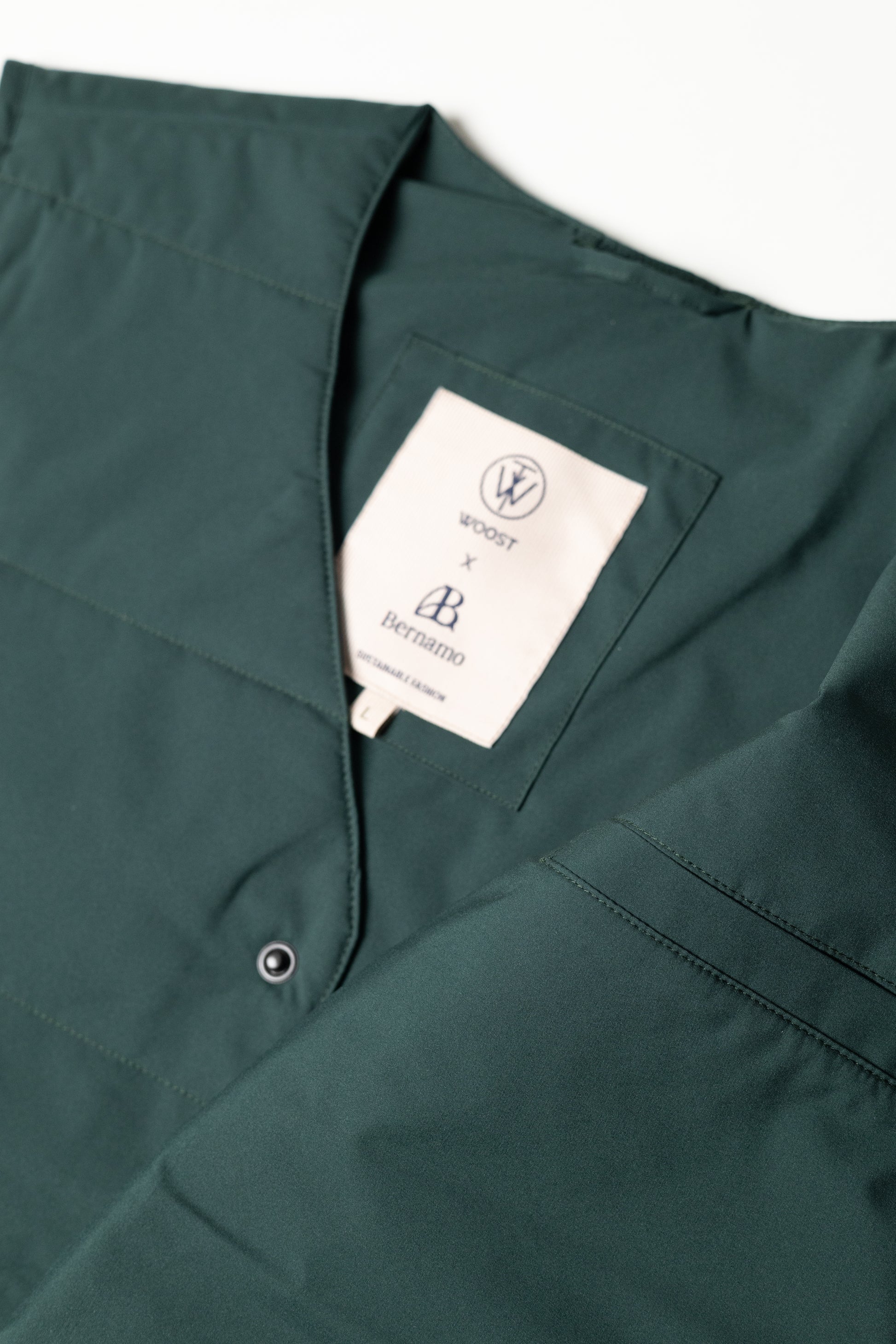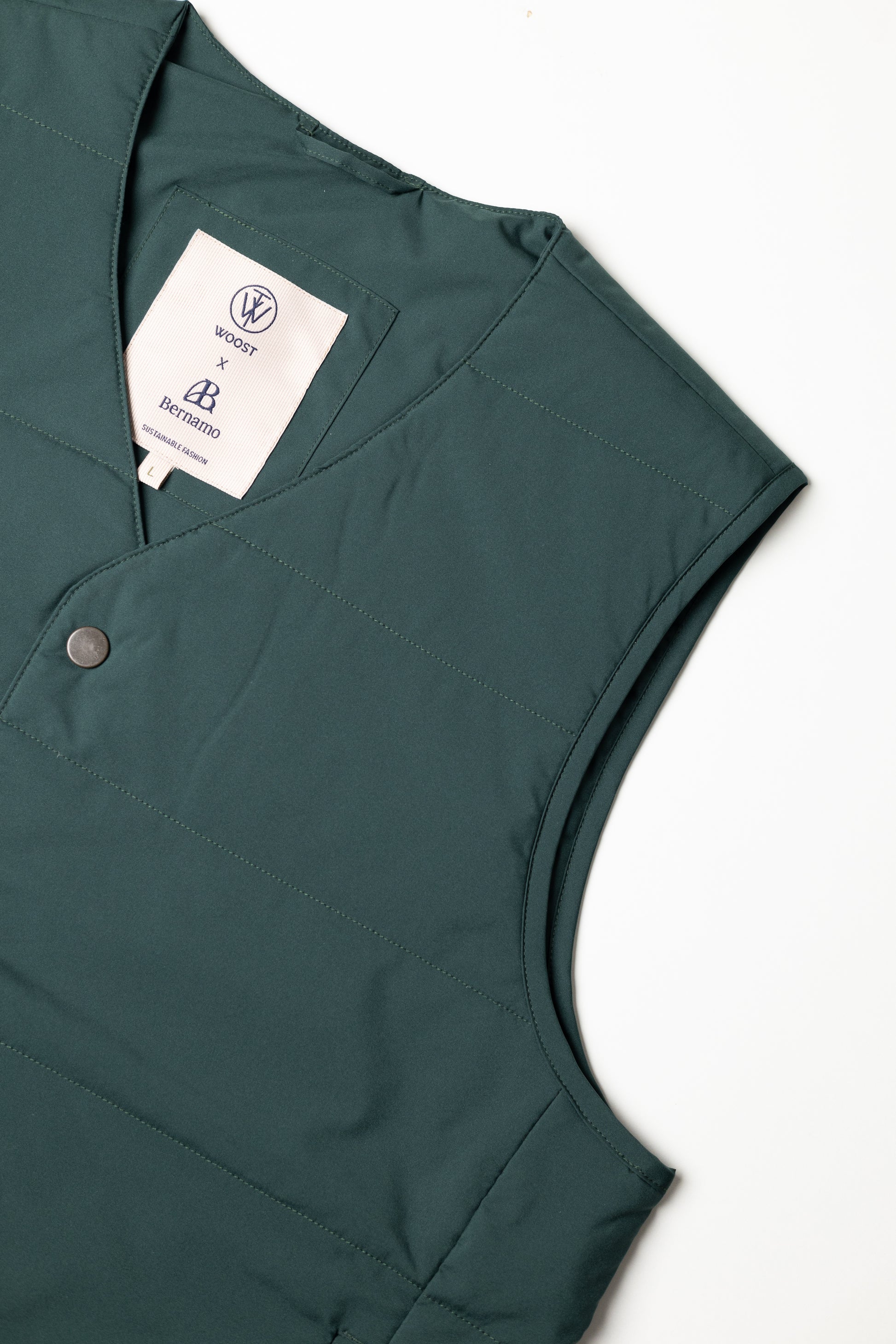 This vest strikes the perfect balance between comfort and sustainability, making it an excellent option for midseason days. Constructed from 100% recycled polyamide, it offers water-repellent protection against light rain. The insulating fill, a blend of recycled down, feathers, and technical fibers, provides warmth without excess weight, so you can even wear it under your jacket. Its timeless design features practical snap buttons and generous pockets, both on the outside and an additional inner pocket for extra storage. Handmade in the EU with fully sustainable, recycled materials, this vest effortlessly combines style with functionality.
